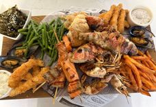 1500 г • Креветки Тэмпура, креветки королевские в панцире, семга на шпажках, барабулька тушка, новозеландские мидии, филе окуня, батат фри, морская капуста, фасоль стручковая, трюфельный айоли, соус «Тартар»