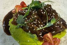 Говяжьи щечки с пюре из зеленого горошка с соусом «Деми Гласс»